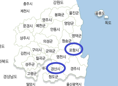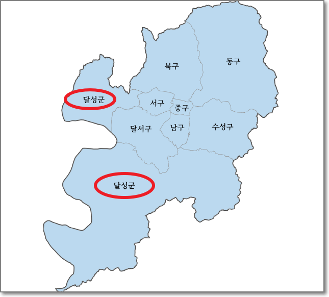 대구는 중구, 동구, 서구, 남구, 북구, 달서구, 달성군 까지 해서 7곳,