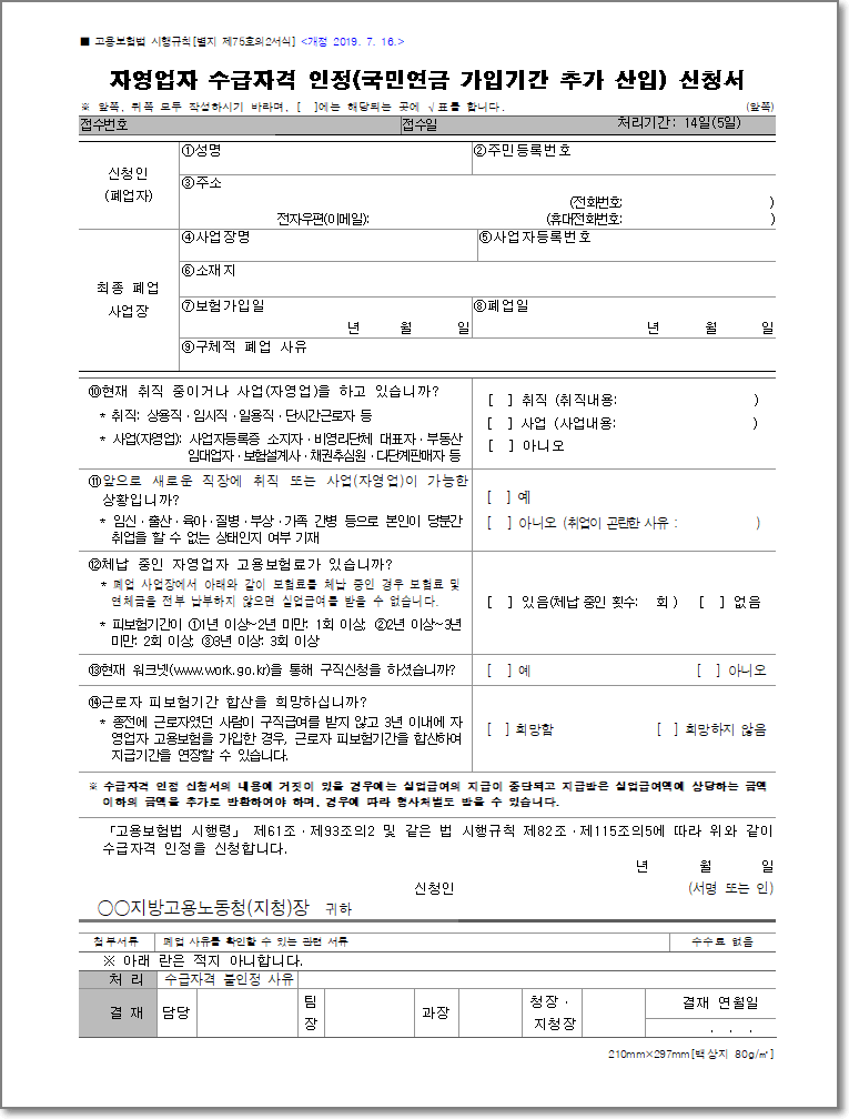자영업자 수급자격 인정(국민연금 가입기간 추가 산입) 신청서
