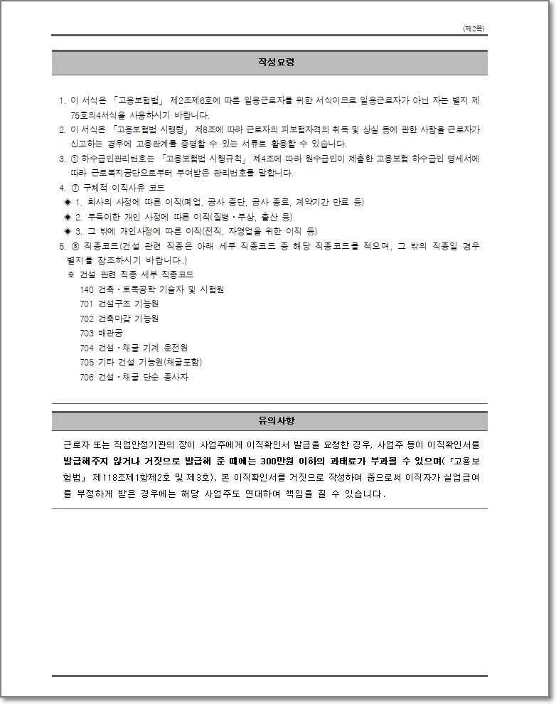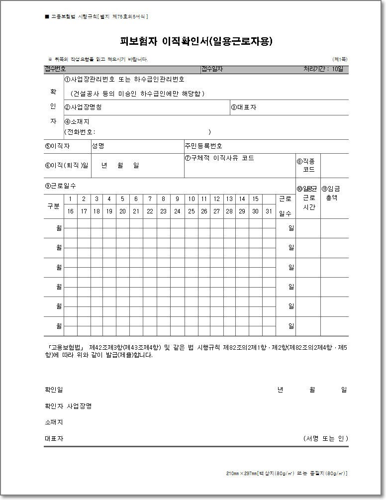 피보험자 이직확인서(일용근로자용) (이직사유에 자발적 사유는 불가합니다.)