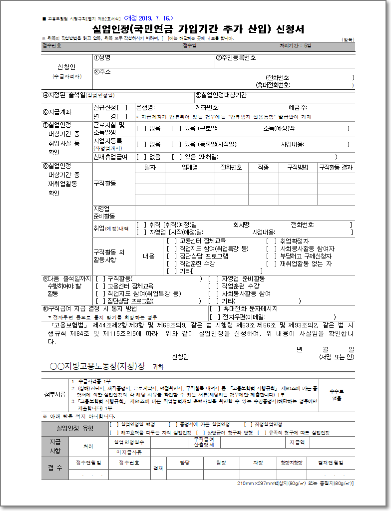 실업인정(국민연금 가입기간 추가산입) 신청서