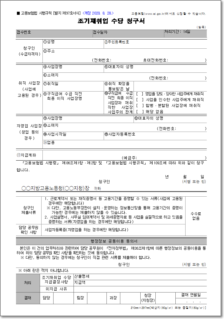 조기재취업수당 청구시 위에 있는 "조기재취업수당청구서"외에 근로계약서 또는 연봉계약서 사본, 조기재취업수당에 따른 확인서를 함께 제출해야 합니다.