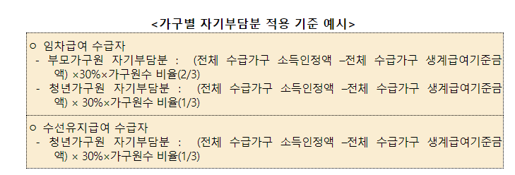 - 예를 들어, 부모(2인)와 청년(1인) 총 3인으로 구성된 가구의 경우, 자기부담분은 부모에게는 30%×2/3, 청년에게는 30%×1/3를 적용하여 공제합니다.