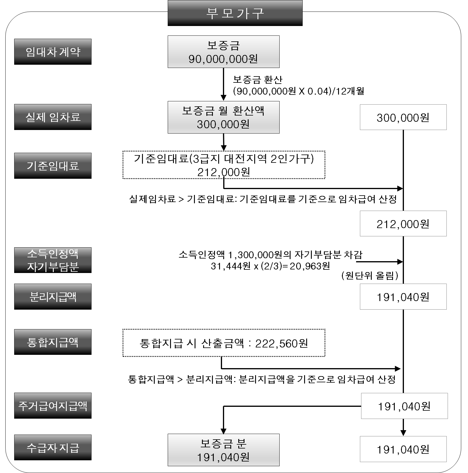 ㅇ 보장가구의 소득인정액 1,300,000원은 생계급여 선정기준(3인 기준) 1,195,185원보다 크므로, 전체 자기부담분(31,444원) 중 부모가구의 가구원수 비율(2/3)인 자기부담분 20,963원을 기준임대료 212,000원에서 차감한 191,040원을 부모가구의 주거급여액으로 산정하고 부모의 급여계좌에 입금