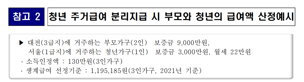 학업이나 구직 등을 목적으로 부모와 따로 거주하는 청년의 경우, 학자금 부담과 비싼 주거여건으로 인해서 경제적 어려움을 겪고 있고, 특히 저소득층 청년에게 있어 가장 큰 어려움은 주거비 마련이라는 점에 착안하여 사실상 별도가구인 청년에게 주거급여를 따로 지급함으로써 안정적인 미래와 자립을 도모할 수 있도록 하기 위함입니다.