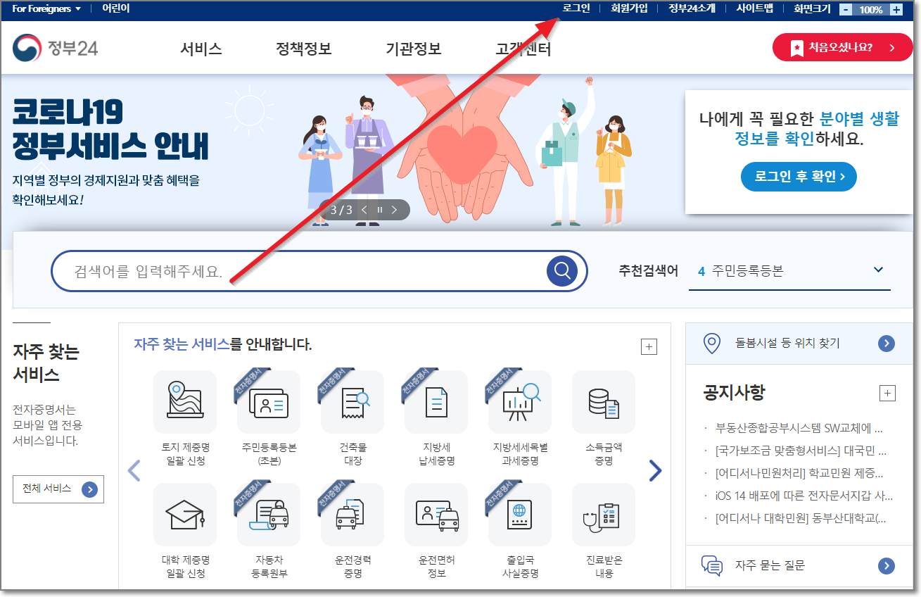 아래와 같은 화면이 나오면 화살표가 가리키는 곳을 클릭해서 "로그인"부터 합니다. 공인인증서가 필요합니다.