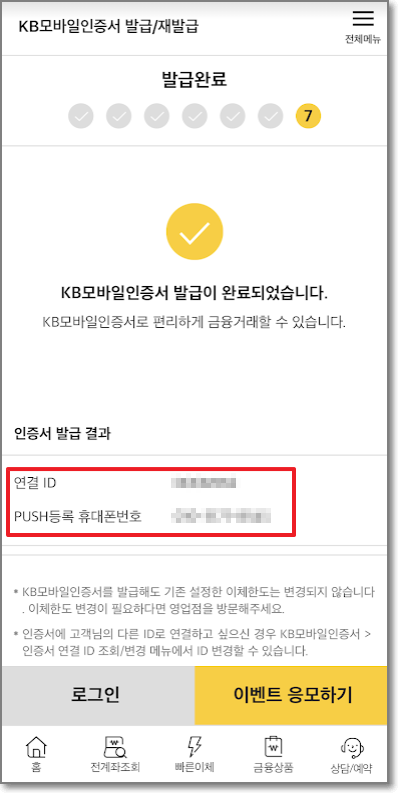 혹시 연결ID나 PUSH등록 휴대폰번호가 잘못 되었다면 KB모바일인증서 > 인증서 연결 ID조회/변경 메뉴에서 변경하시면 됩니다.