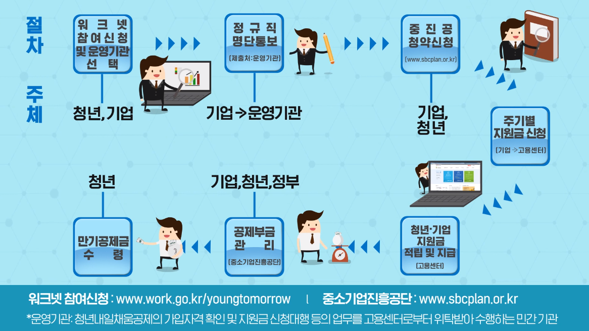 워크넷에 청년 근로자와 기업이 모두 참여신청을 하면 운영기관의 자격심사 선발이 이루어지고 기업과 지원 협약을 체결한 이후 중소기업진흥공단 홈페이지에서 기업이 먼저 청년이 다음으로 순차적으로 신청해서 승인되면 청년내일채움공제 신청이 완료됩니다.