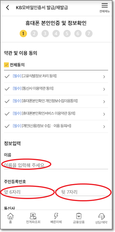 약관 전체동의 하시고, 이름과 주민번호를 입력합니다. 주민번호 뒷자리는 입력창이 바뀌어서 뜹니다.