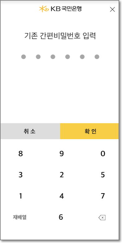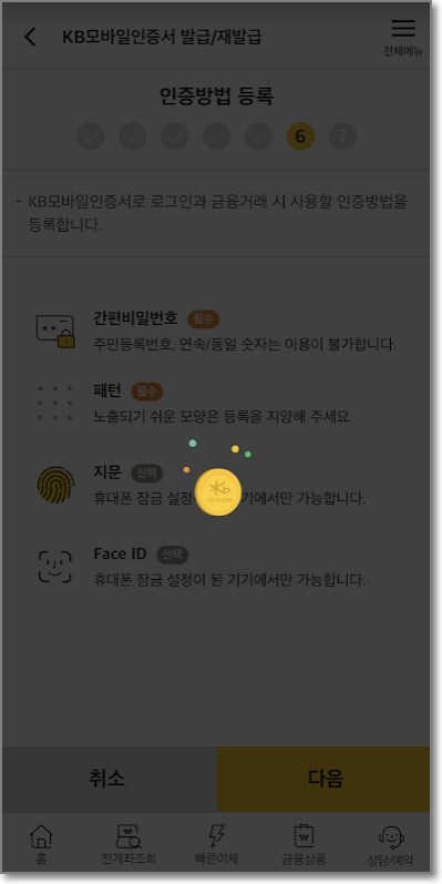 간편비밀번호와 패턴은 필수이고, 지문이나 FaceID는 선택입니다. "다음"을 누르면 기존 간편비밀번호를 입력하라고 나옵니다. 입력합니다.