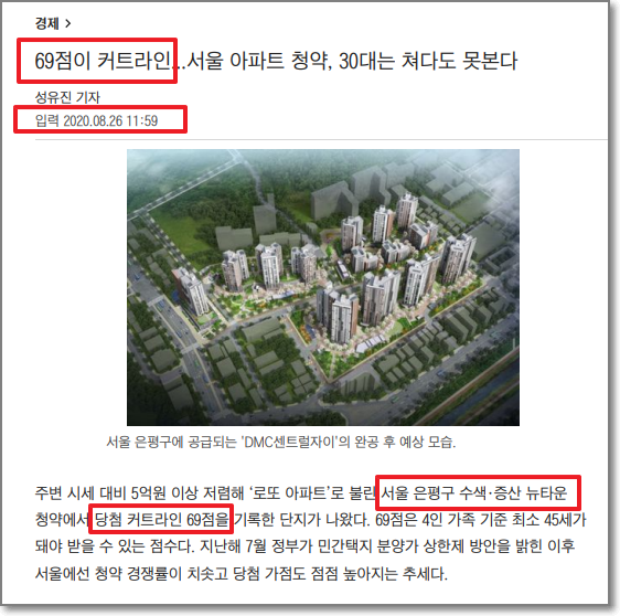 2020년 8월26일 뉴스에도 서울 은평구 수색.증산 뉴타운 청약에서 커트라인이 69점이었다고 합니다.