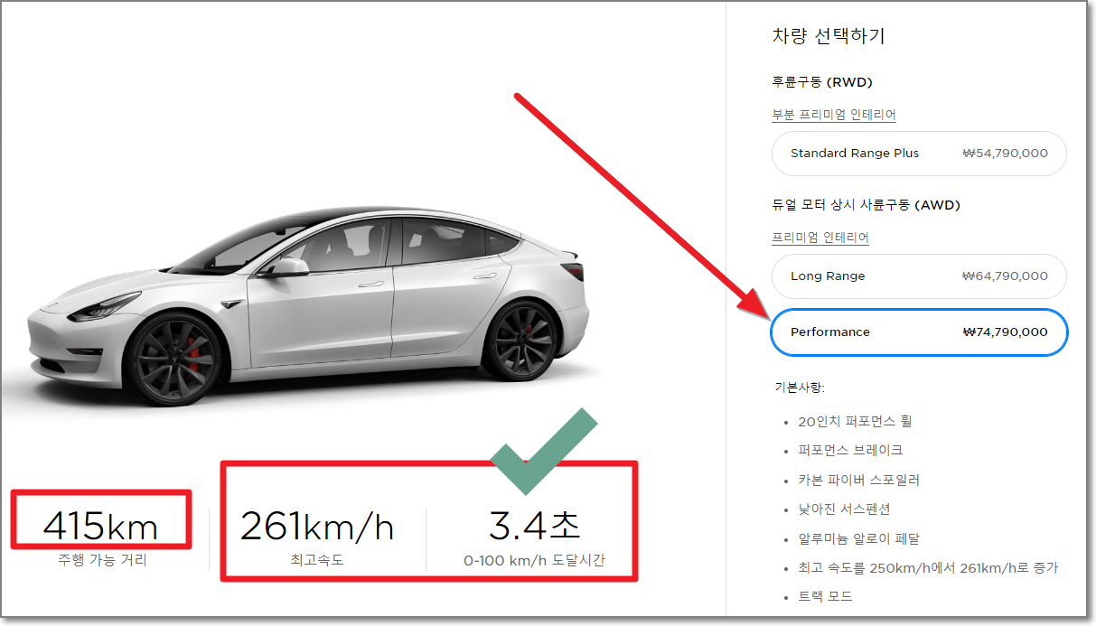 마지막으로 퍼포먼스라는 버전이 있는데요. 풀충전으로 주행가는 거리는 415Km이지만 최고속도는 261km/h 이고 그보다 더 놀라운 점은 제로백이라고 하는 가속력을 나타내는 시간이 무려 3.4초 입니다.