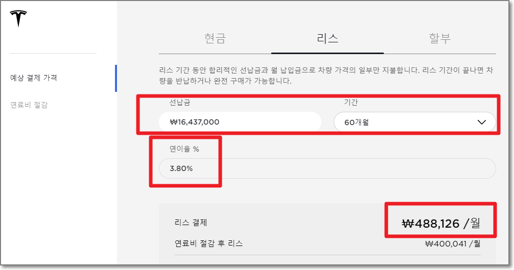 리스를 보면, 연이율 3.8%로(기간을 36개월하나 60개월하나 이율을 같음) 선납금 1640만원정도 냈을 때 매월 488126원 내게 되며, 이는 리스가 끝나면 차량을 반납하거나 추가금을 내고 인수도 가능합니다.