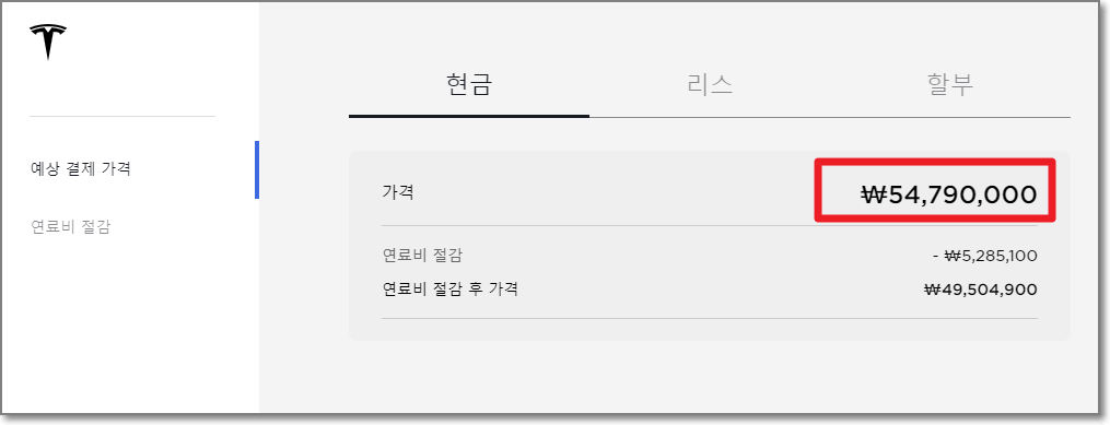 테슬라 홈페이지에서 바로 구매를 진행할 경우(한국에 딜러 없습니다.) 아래처럼 현금, 리스, 할부를 선택할 수 있늑데요.