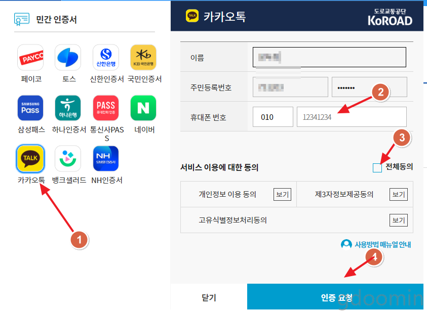 창이 뜨면, 아래그림처럼 순서대로 체크 및 입력 후 '인증요청'을 누릅니다.