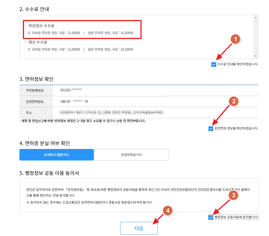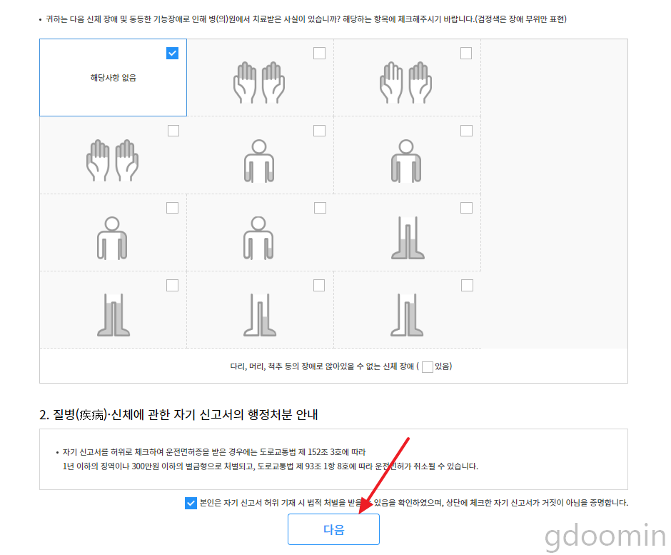 자기신고서를 허위로 작성할 경우 1년 이하의 징역이나 300만원 이하의 벌금으로 처벌될 뿐만 아니라 도로교통법 제 93조 1항 8호에 따라 운전면허가 취소될 수 있다고 합니다. 모두 체크하고 다음을 누릅니다.