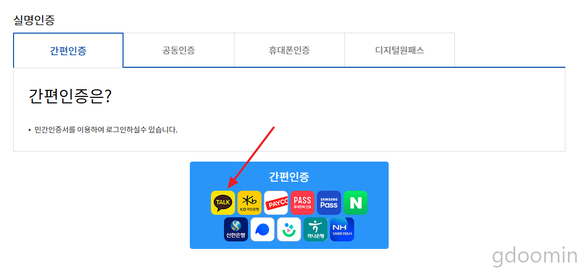 간편인증, 공동인증, 휴대폰인증, 디지털원패스 총 4종의 실명인증 방법중 편리한 것으로 진행합니다. 여기서는 카카오톡으로 진행하겠습니다.