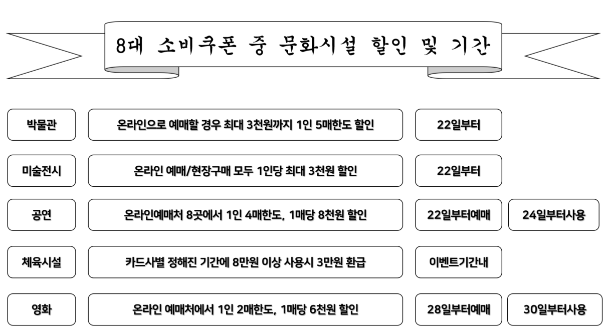 정부가 그동안 코로나19 재확산으로 제한되었던 문화 및 여가활동을 방역을 철저히 하는 전제하에 다시 8대 소비쿠폰을 통해서 지원하기로 했습니다.