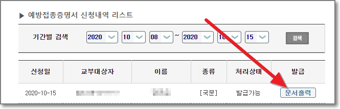 기간은 민원을 신청한 기간이지 예방접종내역의 기간이 아니니까 그대로 두시고 "문서출력"을 누릅니다.