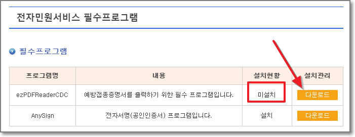 전자민원을 위해서 필수로 필요한 프로그램이 있습니다. 다행히 공인인증서 프로그램은 있고, 그위에 미설치가 하나있습니다. "다운로드"를 클릭합니다.