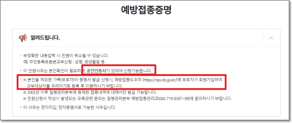 예방접종증명서의 신청인에 빨간 점표시는 필수 입력사항입니다만 공인인증서로 로그인 했기때문에 이부분은 자동으로 입력이 되어있을 것입니다.