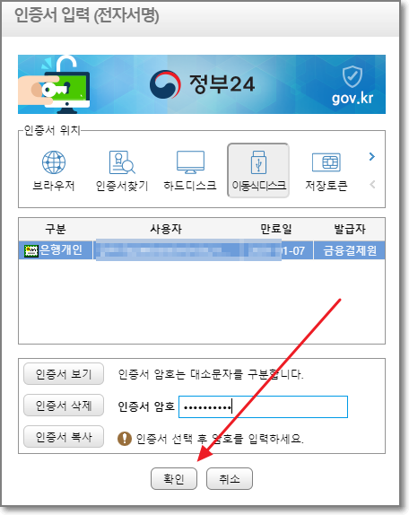 공인인증서 선택 후 인증서 암호를 입력하고 확인을 누릅니다.