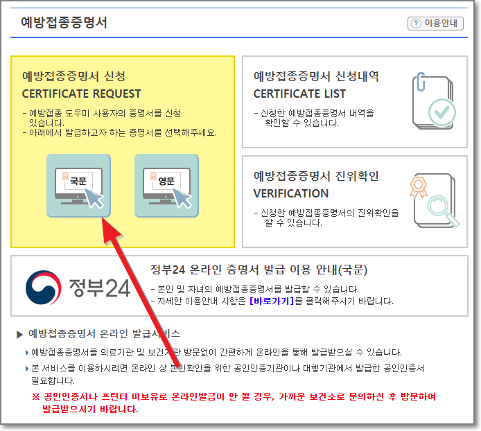 아래 보시면, "정부24"에서도 발급 가능하다고 안내하고있습니다. 우리는 여기서 발급받는 방법을 알아볼 것이기 때문에 화살표가 가리키는 "예방접종증명서 신청"에서 "국문"을 누릅니다.