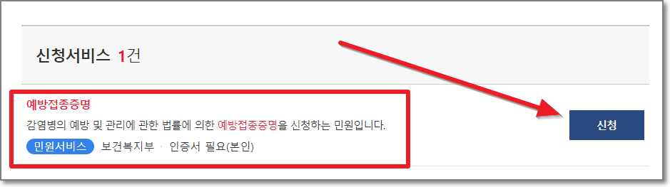 다시 이화면이 나오게되는데요. 여기서 화살표친 "예방접종증명서 신청내역"을 누릅니다.