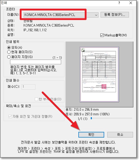 프린터가 제대로 선택되었는지 확인하시고, "확인"을 누릅니다.