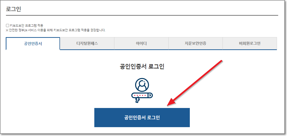 정부24와 마찬가지로 "공인인증서"를 필요로 합니다. 인증서위치 선택하고 암호입력후 "확인"을 누릅니다.