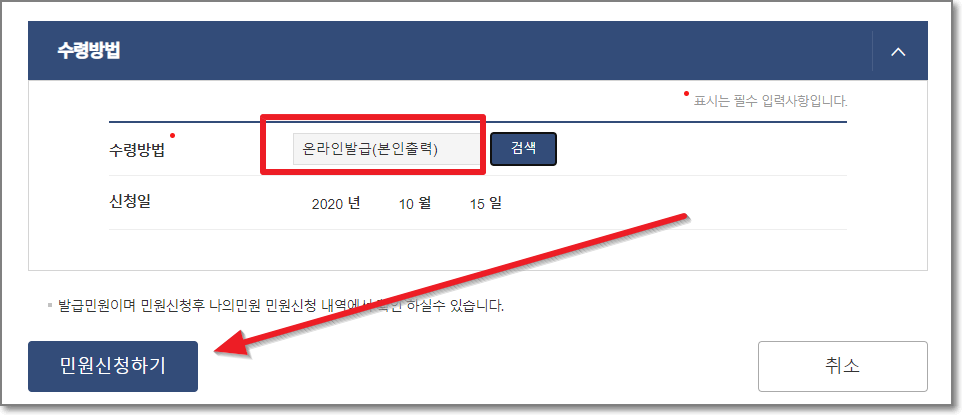 수령방법은 "온라인발급(본인출력)"으로 하시고 "민원신청하기"를 누릅니다.