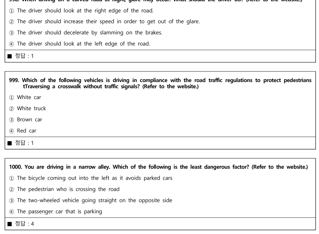 도로교통공단에서 직접 문제은행을 제공하며 총 1000문제가 있고, 실제 시험은 40문제가 출제됩니다.