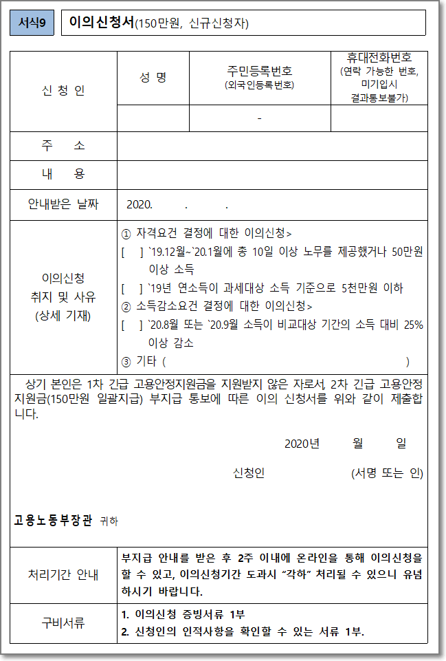 ▶ 이의신청서(50만원, 1차 긴급고용안정지원금 기지급자)