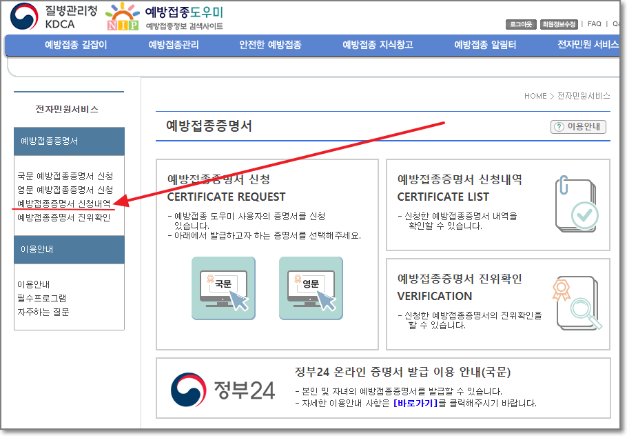 다시 이화면이 나오게되는데요. 여기서 화살표친 "예방접종증명서 신청내역"을 누릅니다.