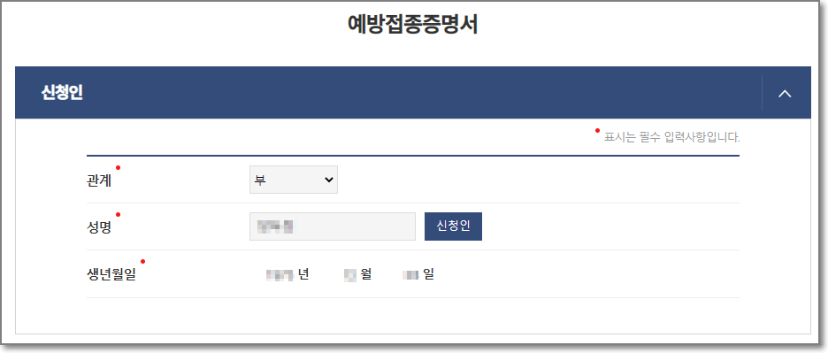 예방접종증명서의 신청인에 빨간 점표시는 필수 입력사항입니다만 공인인증서로 로그인 했기때문에 이부분은 자동으로 입력이 되어있을 것입니다.