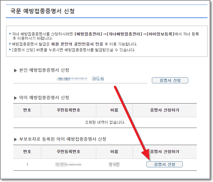 역시 아이의 보호자로 등록이 되어있지 않으면 예방접종증명서 신청을 하실 수 없습니다. 처음부터 이 글을 보셨다면 위에서 "예방접종 도우미 보호자등록"을 하셨을 것이니까 아래처럼 아이의 이름이 나오게 됩니다.