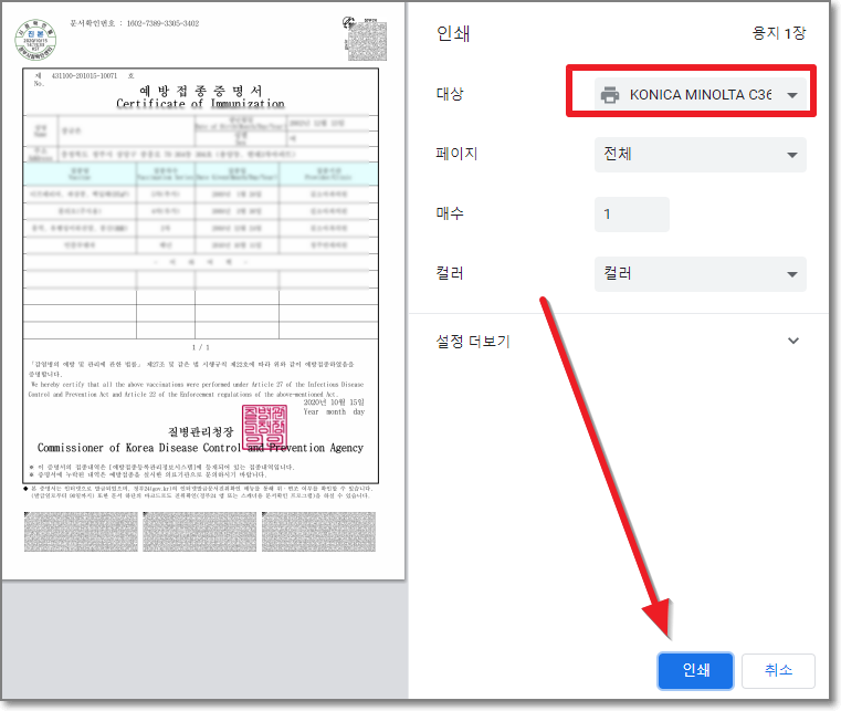 문서가 어떻게 나올지 확인을 쭉 하시고, "인쇄"를 누릅니다.