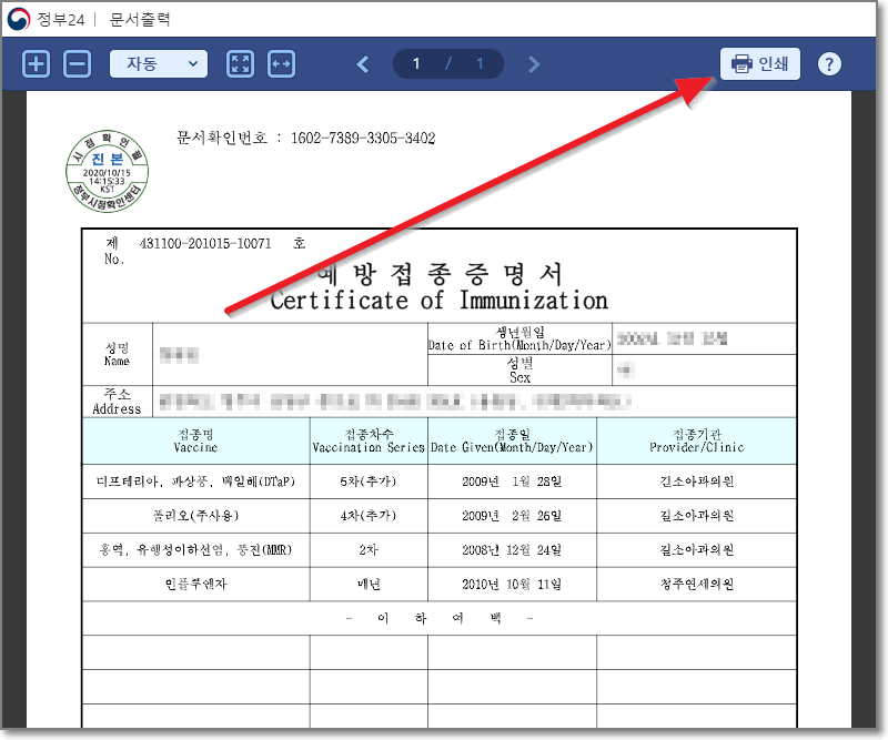 정부24에서 뽑은 것과 예방접종도우미 에서 출력한 것을 비교해보았습니다. 내용은 똑같이 나오는데, 문서 디자인이 조금 다릅니다.