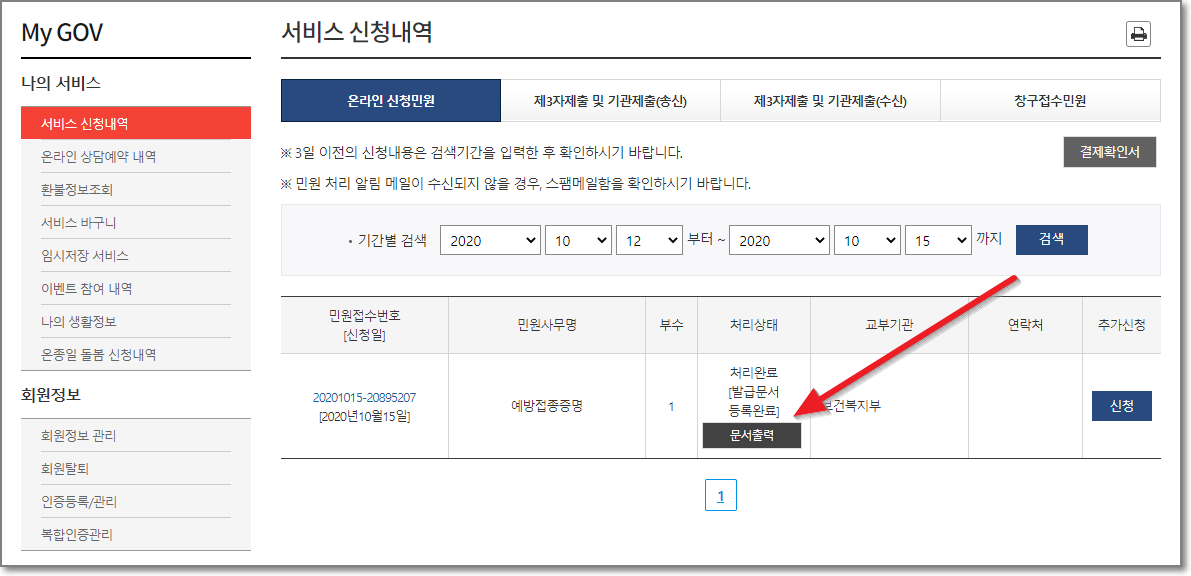 기간은 민원을 신청한 기간이지 예방접종내역의 기간이 아니니까 그대로 두시고 "문서출력"을 누릅니다.