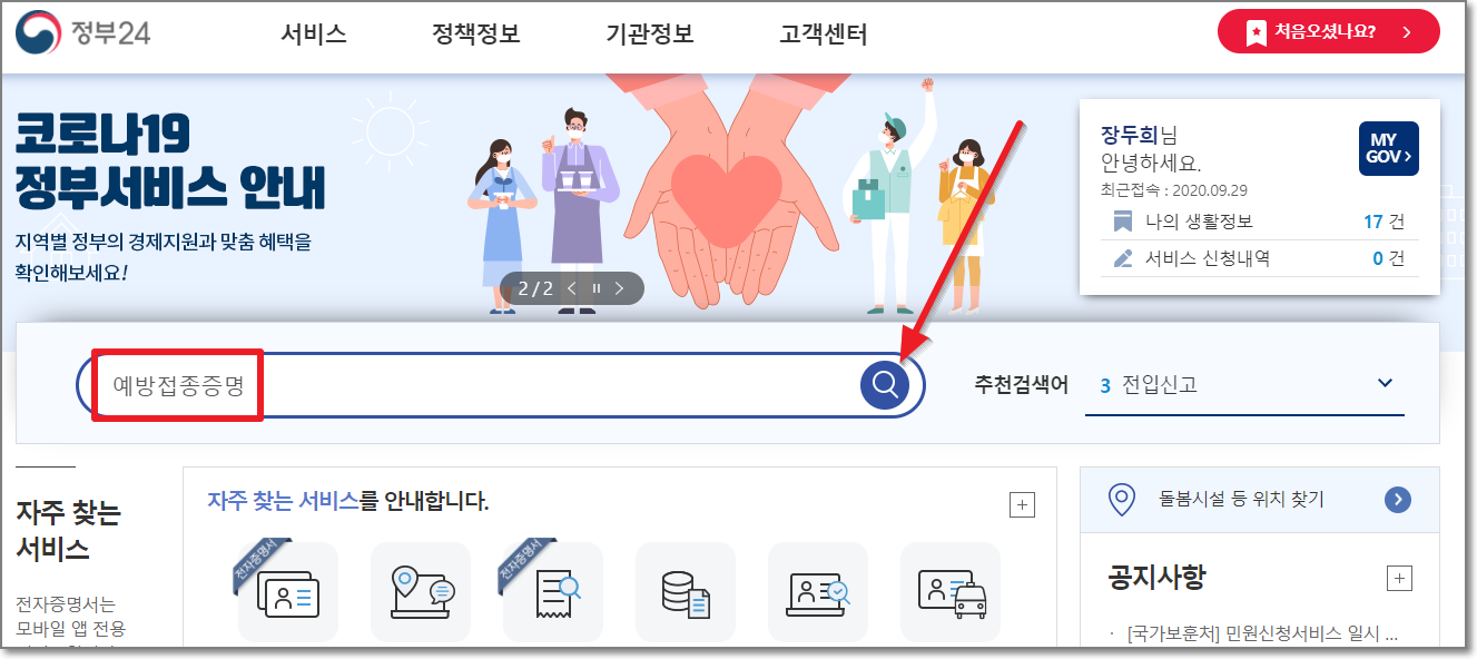 로그인 후 만나는 첫 페이지의 검색창에 "예방접종증명"이라고 칩니다. "예방접종증명서"라고 치면 안되더라고요.