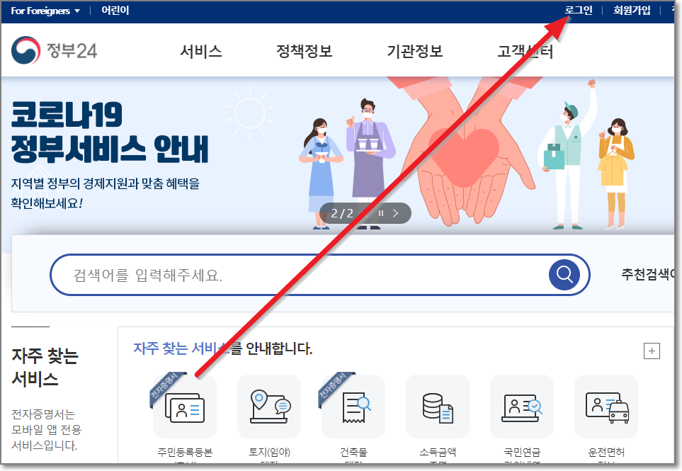 우선 "정부24"에서 발급받아보겠습니다. 링크를 눌러서 정부24로 들어가면 새창으로 열리는데요. 화살표처럼 "로그인"을 눌러서 로그인을 합니다.