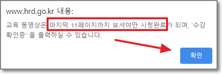 마지막11페이지까지 보셔야 시청완료가 되고, "수강확인증"을 출력할 수 있습니다. "확인"을 누릅니다.