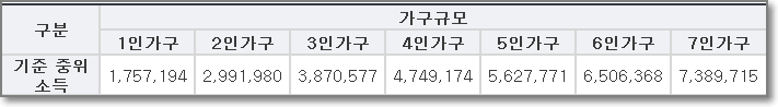 ● 2020년 기준 중위소득은 아래 표와 같습니다.