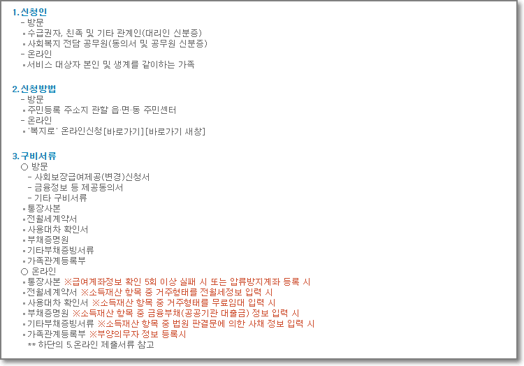 생계, 의료, 주거, 교육급여 중에서 주거급여와 교육급여는 온라인 신청이 가능하지만, 생계급여와 의료급여는 반드시 주민센터에 방문을 해서 상담 후에 서비스 신청을 해야 합니다.