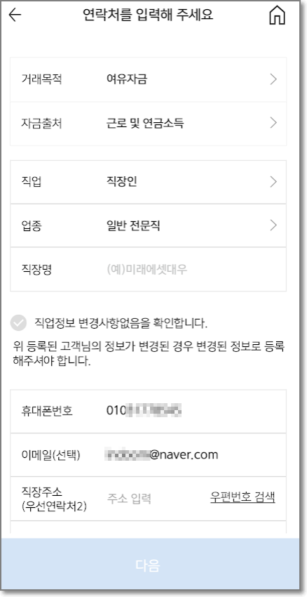 업종, 직장명, 휴대폰 번호, 이메일, 직장 주소, 자택 주소를 입력하고 "다음"을 누릅니다.(업종 무직으로 해도 아무 상관없습니다.)