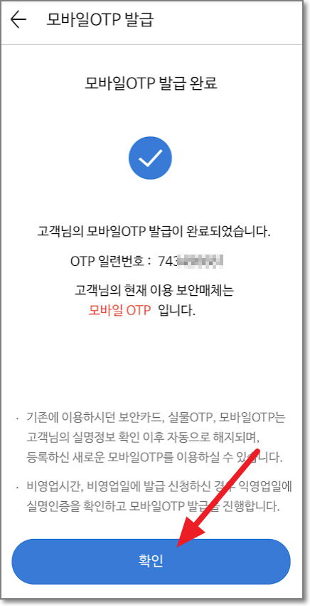 계좌는 개설되었고, 이제 방금 하던 모바일 OTP를 계속 설명하겠습니다. 아래처럼 모바일 OTP 발급을 누릅니다.