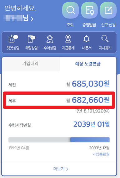 조회가 끝나면 바로 "예상 노령연금"이 나오게 됩니다. 저는 세후 682,660원을 받게 되는군요.