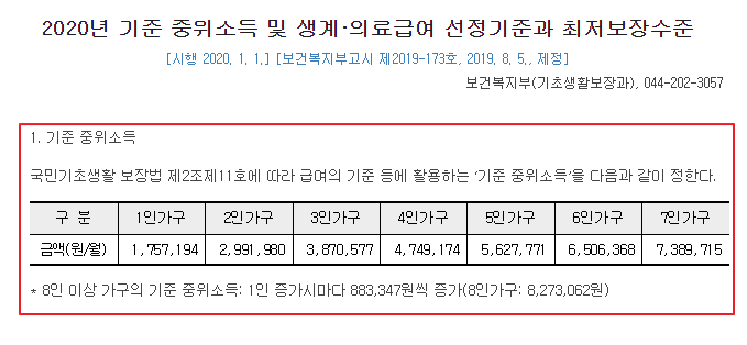 2020년 1월1일 고시된 기준 중위소득은 아래와 같습니다.
