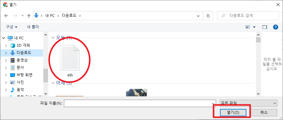 아까 받은 "다운로드"폴더에 있는 ads.txt 파일을 클릭하고 "열기"를 누릅니다.