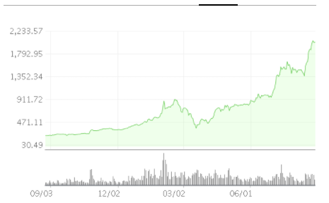 작년 12월만 해도 450달러였고, 금년 6월에는 1000달러를 넘어서서 이제는 2000달러를 넘고 있습니다.