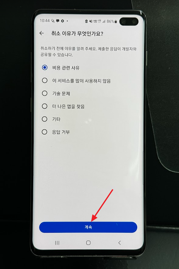 취소 이유를 물어보는데요. 저는 '비용 관련 사유'라고 했습니다. 원하는 취소 이유를 선택했으면 아래쪽에 '계속'을 누릅니다.